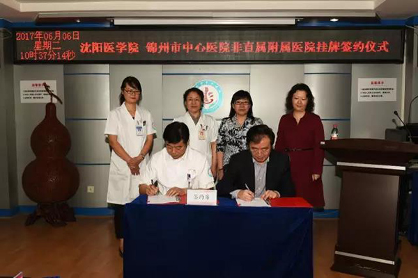 掛牌儀式上,錦州市中心醫(yī)院院長(zhǎng)張一兵與沈陽(yáng)醫(yī)學(xué)院副院長(zhǎng)韓松簽署《沈陽(yáng)醫(yī)學(xué)院 錦州市中心醫(yī)院建立非直屬隸屬關(guān)系附屬醫(yī)院的協(xié)議書(shū)》。