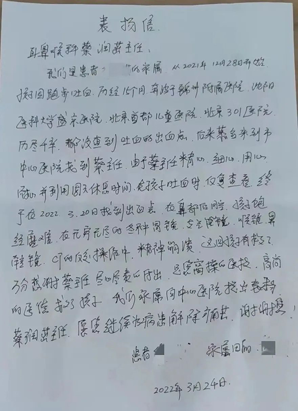 在錦州市中心醫(yī)院康復(fù)后,飽受吐血困擾的14歲的小美女家長,為醫(yī)院耳鼻喉科送來了感謝信和錦旗。字里行間都體現(xiàn)了身為父母的感激和欣慰。