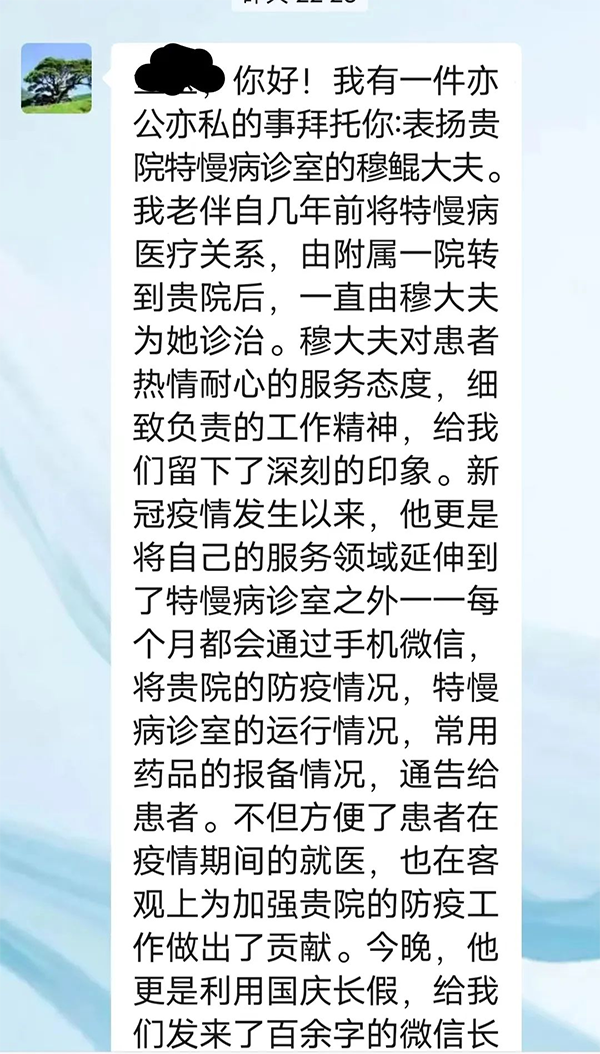 慢病患者表?yè)P(yáng)穆鯤大夫,在國(guó)慶放假期間穆大夫還抽時(shí)間給患者發(fā)了百余字的微信長(zhǎng)文囑咐,詳細(xì)給患者介紹了最后幾個(gè)月特慢病就診的注意事項(xiàng),讓患者十分感動(dòng)。
